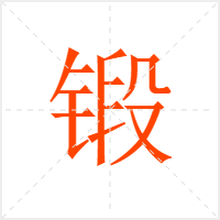 duàn锻造:~铁|~工|~接。 【锻锤】金属压力加工用的机器,由动力带动锤头上下移动而产生压力。常见的有空气锤、蒸汽锤等。 【锻工】(1)把金属材料加热到一定高的温度,用锤子击打的操作过程。(2)从事锻工工作的技术工人。 【锻件】经锻造工序制成的毛坯或工件。 【锻炼】(1)通过体育运动使身体强壮,培养勇敢、机警和维护集体利益等品德:~身体,保卫祖国。(2)通过阶级斗争,生产斗争和科学实验,使政治觉悟、工作能力提高。 【锻铁】用生铁精炼而成的含碳量在0.15%以下的铁,有韧性、延性,强度较低,容易锻造和焊接,不能淬火。用来制造铆钉、链条、镰刀等。也叫熟铁。 【锻压】锻造和冲压的统称。 【锻造】用锤击等方法,使在可塑状态下的金属工件具有一定的形状和尺寸,并改变它的物理性质。