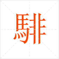 详细字义 ◎騑 騑fēi 〈名〉 (1)(形声。从马,非声。本义:旁马) (2)同本义。古代驾车的马,在中间的叫服,在两旁的叫騑,也叫骖[horsesharnessedtoacart] “骖旁马。——《说文》。按,驾三马曰骖,中一马曰驾,旁两马曰騑也。” 在左骖马轭上。——《续汉书·舆服志》。注:“马在中曰服,在外曰騑。騑亦名骖。” 郑公子騑字子驷。——《左传·襄公八年》 俨骖騑于上路。——王勃《滕王阁序》 (3)又如:蚍(騑马和服马。泛指驾车的马);騑驾(有旁马的车驾);騑骖(四马车驾中在辕外的两匹马) (4)泛指马[horse]。如:騑驹(小马);騑辔(马缰) (5)三岁的马[athree-year-oldhorse] 马二岁曰驹,马三岁曰騑。——《本草纲目》 词性变化 ◎騑fēifēi [gallopping]马行走不停的样子 四牡騑騑。——《诗·小雅·四牡》