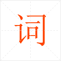 cí①<名>言词,词语。《促织》:“巫从旁望空代祝,唇吻翕辟,不知何~。”《柳敬亭传》:“幕下儒生设意修~,援古证今,极力为之。”②<名>一种韵文形式,又叫“长短句”。如“宋词”、“辛弃疾词”。 【词话】1.评论词的内容、形式或词的作者的书,体裁同诗话相似。2.元明时说唱艺术的一种,形式有说有唱。3.明代章回小说里夹有诗词的也叫词话。 【词林】1.指汇集在一起的文词。也指文人聚集在一起。萧统《答晋安王书》:“殽核坟中,渔猎~。”杜甫《八哀诗·赠秘书监江夏李公邕》:“忆昔李公存,~有根柢。”2.翰林院的别称。如《沁园春》、《水调歌头》、《永遇乐》、《蝶恋花》等。词牌规定的韵律、段数、句数、字数、句式、声律等的规格。不同的词牌,其规格也不同。 【词藻】诗文中富丽华美而有文采的词句。也作“辞藻”。 【词章】诗文的总称。也作“辞章”。 【词致】文辞的意趣、情调。