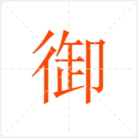 yù①<动>驾车。《殽之战》:“梁弘~戎,莱驹为右。” 【又】<动为动>为……驾车。《左传·成公二年》:“邴夏~齐侯。”②<名>驾车的人。《诗经·车攻》:“徒~不惊。”③<动>驾着;乘着。《三峡》:“虽乘奔~风,不以疾也。”④<动>统治。《过秦论》:“振长策而~宇内。”⑤<动>治理。《齐桓晋文之事》:“刑于寡妻,至于兄弟,以~于家邦。”⑥<动>驾御;控制。《赤壁之战》:“夫以疲病之卒~狐疑之众。”⑦<动>使用;用。《涉江》:“腥臊并~,芳不得薄兮。”⑧<动>侍奉。《尚书·五子之歌》:“厥弟五人,~其母以从。”⑨<动>抵御;抵挡。《殽之战》:“晋人~师必于殽。” yà<动>迎。《庄子·至乐》:“昔者海鸟止于鲁郊,鲁侯~而觞之于庙。” 【御风】乘风而行。 【御沟】入宫的河道。 【御宇】帝王统治国土。